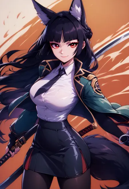 Hoshimi - hoshimi miyabi, fox ears, red eyes, black hair, long hair, jacket, black skirt, black pantyhose,