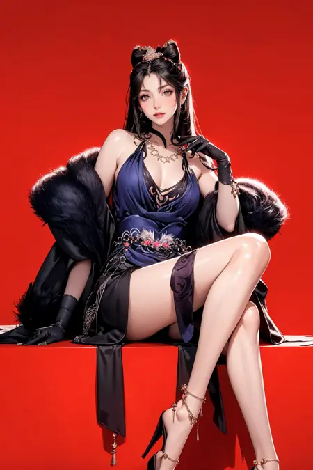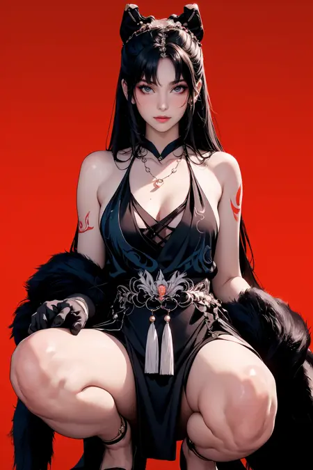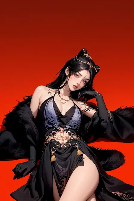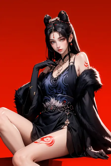 xixingjie,black dress,black hair,chinese clothes,elbow gloves,black hair,fur trim,necklace,jewelry,tattoo,