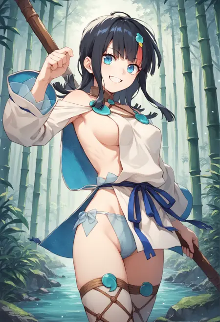 1人の少女、黒髪、ストライプ髪、青い目、中長髪、サイドロール、ジュエリー、リボン、勾玉、露出の多い服、サイドブレスト、外側の袖、パンツ、透け、外側のレギンス
