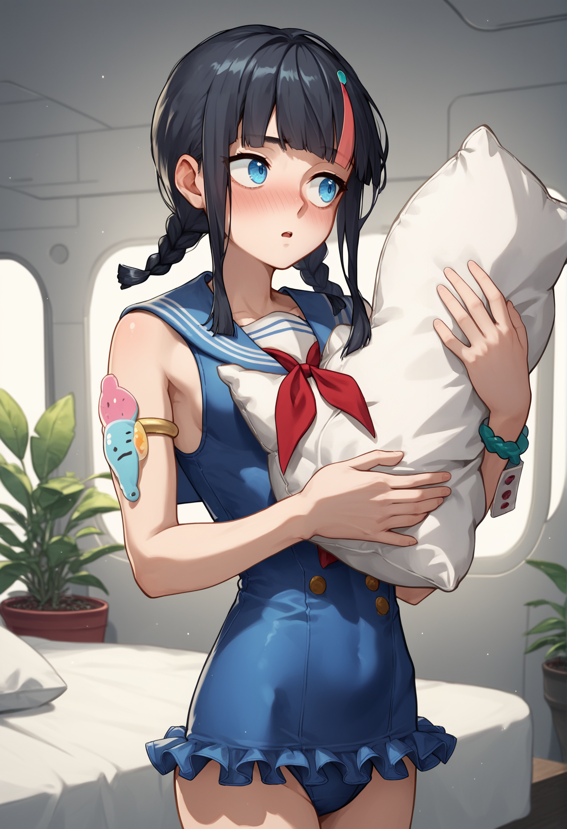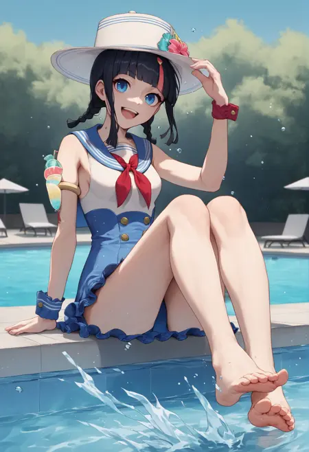 1人の少女、黒髪、ストライプ髪、青い目、中長髪、サイドロール、二つ編み、帽子、セラフク、ドレス水着、腕輪、片手首カフ