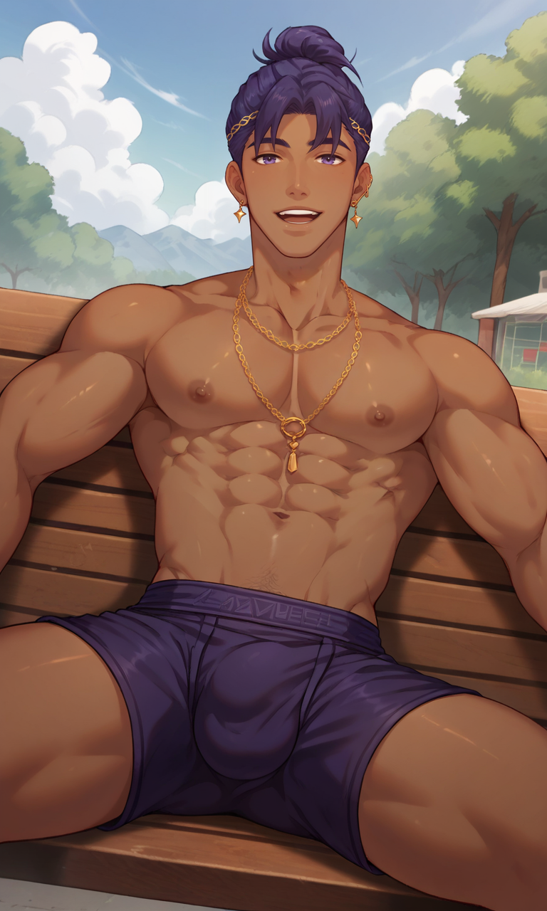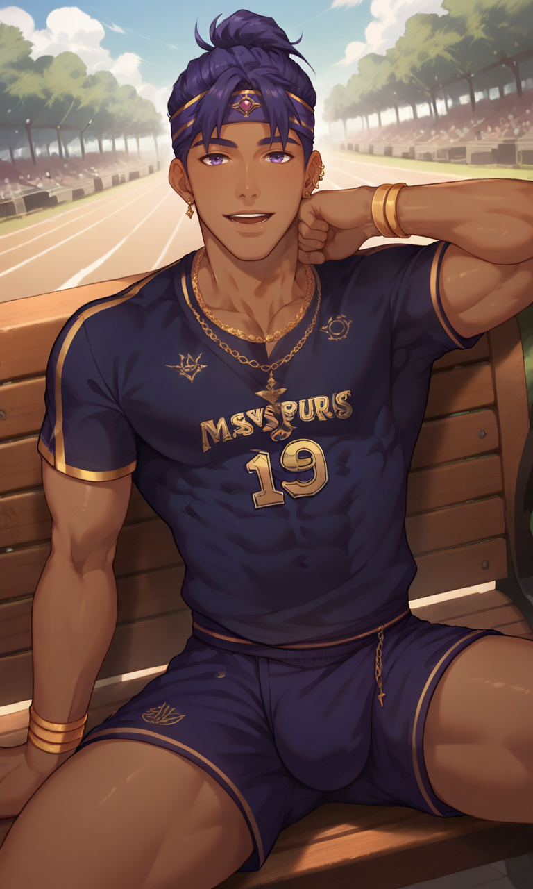 Zayne, jewelry, ear piercing, dark-skinned male, purple t-shirt, purple shorts, headband