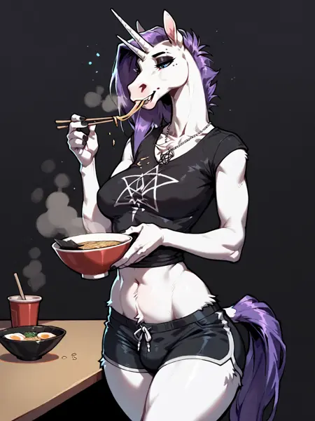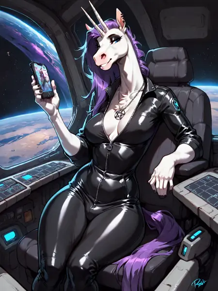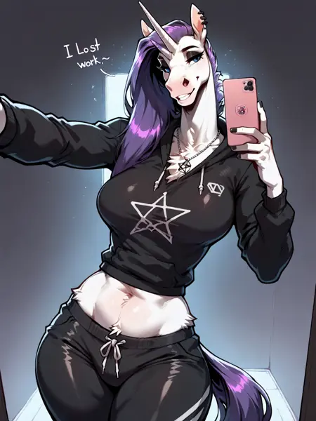 More_ Always wears pentagram necklace (with microprocessor gem). Hates being called a pony. Long legs, long neck, long face, long neck. Sometimes thinks she's a dragon.