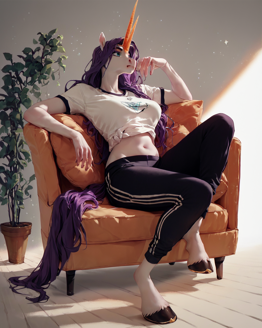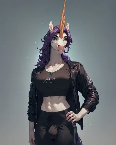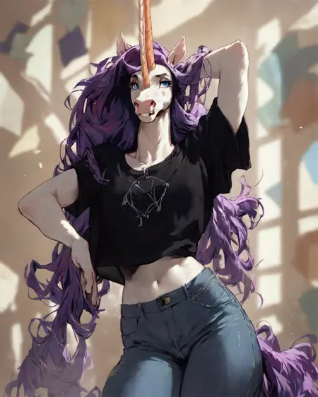 More_ Always wears pentagram necklace (with microprocessor gem). Hates being called a pony. Long legs, long neck, long face, long neck. Sometimes thinks she's a dragon.