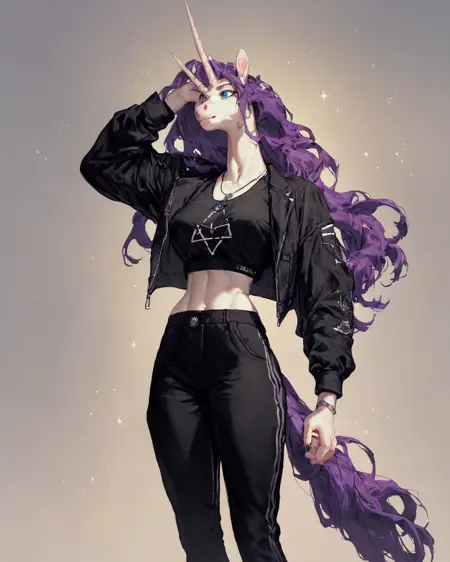 More_ Always wears pentagram necklace (with microprocessor gem). Hates being called a pony. Long legs, long neck, long face, long neck. Sometimes thinks she's a dragon.