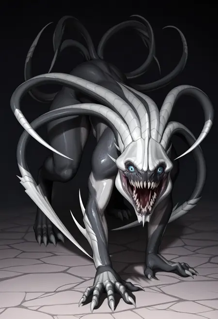 1girl, 怪物, 蓝眼睛, 爪子, 牙齿, 尖锐牙齿, 尾巴, 触手