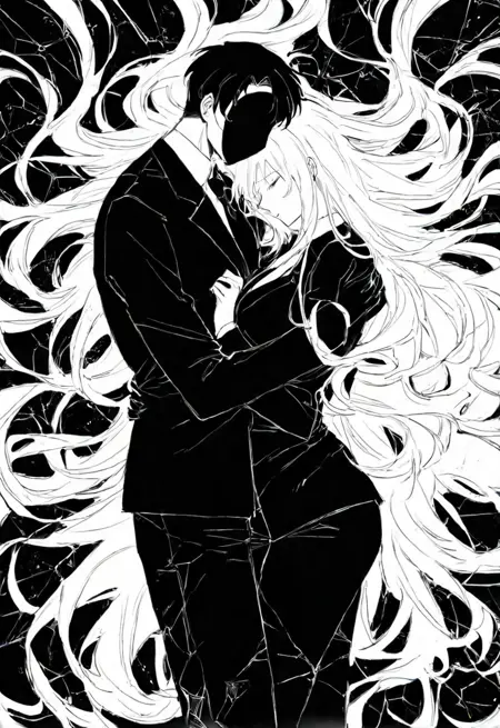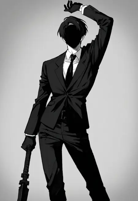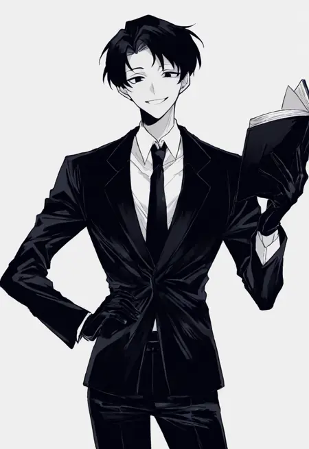 formal suit, white shirt, black necktie, black jacket, black pants, black footwear black gloves