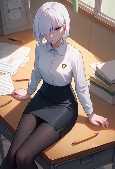Default Outfit: fionadef, short hair, white hair, hair over one eye, grey eyes, blue coat, long sleeves, turtleneck sweater, brown gloves, black pants, earrings