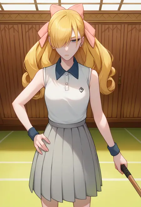 Tennis Uniform: fionatennis, long hair, blonde hair, hair over one eye, hair bow, pink bow, grey eyes, tennis uniform, white shirt, sleeveless shirt, grey skirt, wristband