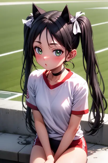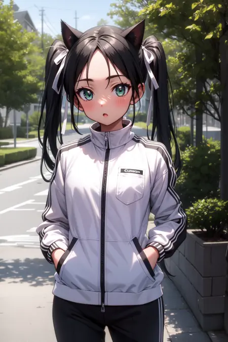 appearance: francesca, green eyes, black hair, long hair, parted bangs, twintails, cat ears, cat tail