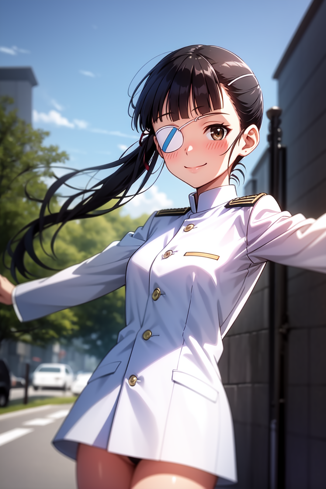 衣装:白いリボン、髪のリボン、白い軍服、長袖、学校用水着、服の下に水着