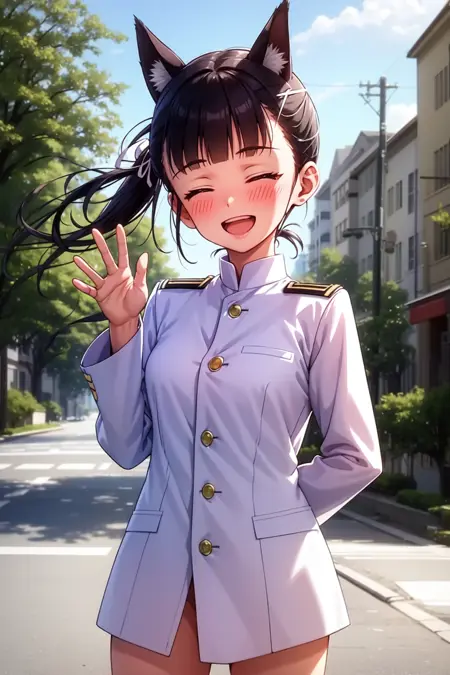 外見:ミオ、茶色の目、アイパッチ、黒髪、ブランケットの前髪、ポニーテール、犬の耳、犬の尾