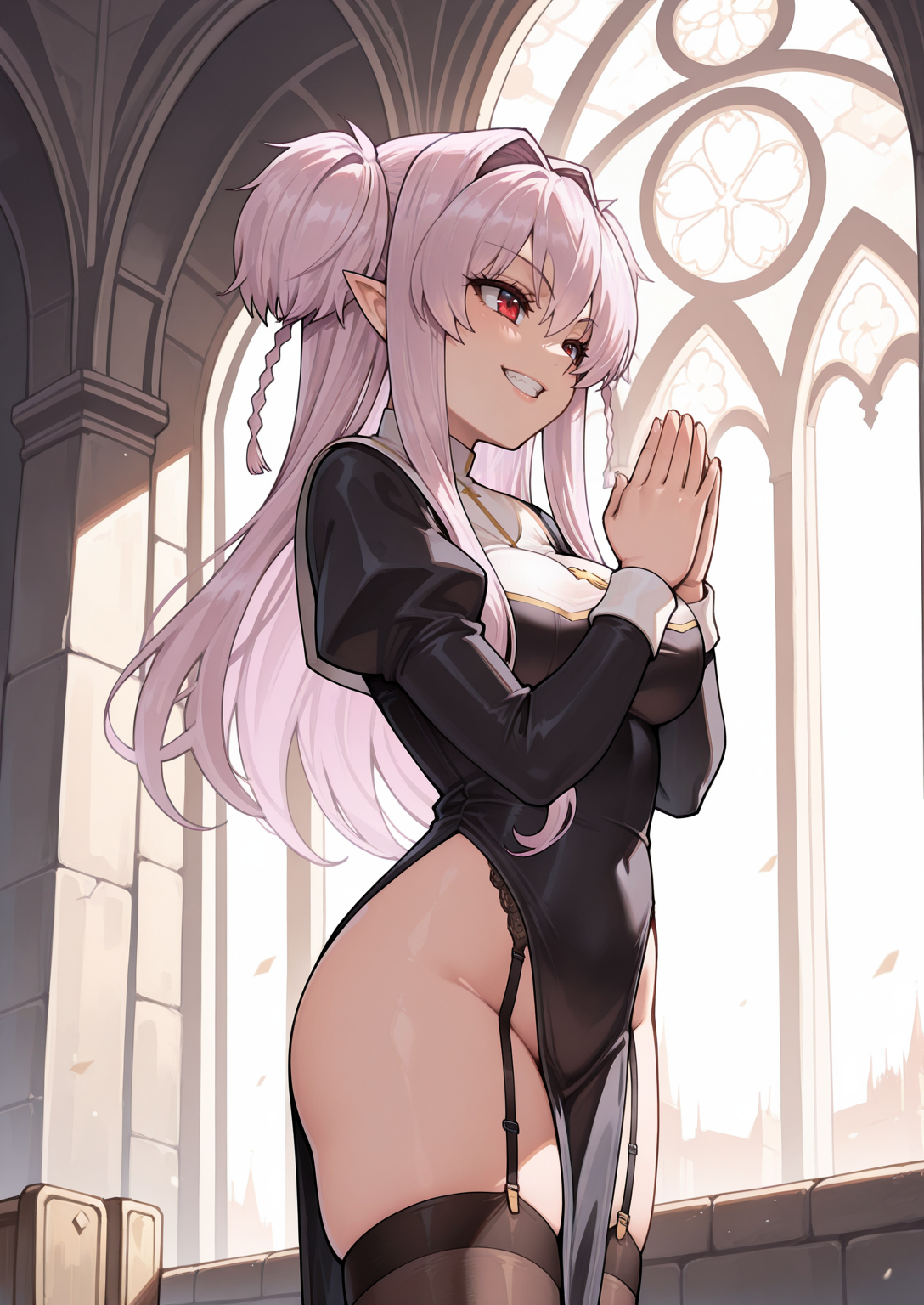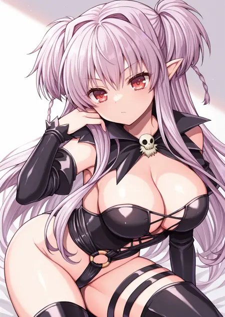 外观:iltwiska,长发,紫色头发,红眼睛,两侧发束,鬓角,尖耳朵,中等胸部