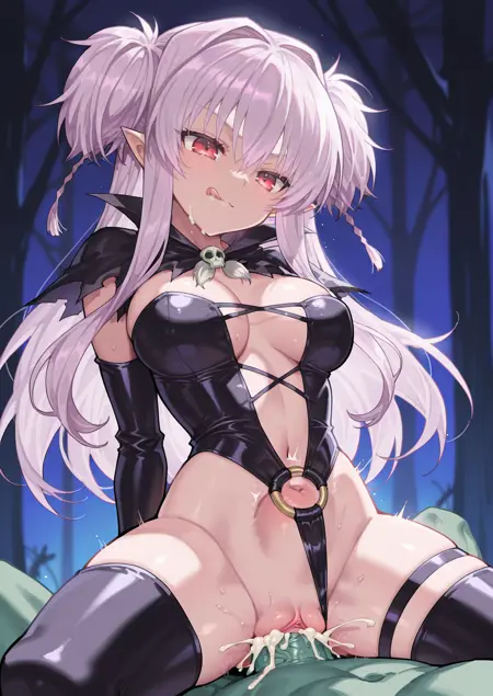 服装:黑色紧身衣,交叉系带服饰,高开腿,丁字裤,黑色项圈,骷髅胸针,O型环,可拆卸袖子,黑色大腿长靴,大腿绑带
