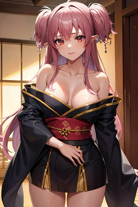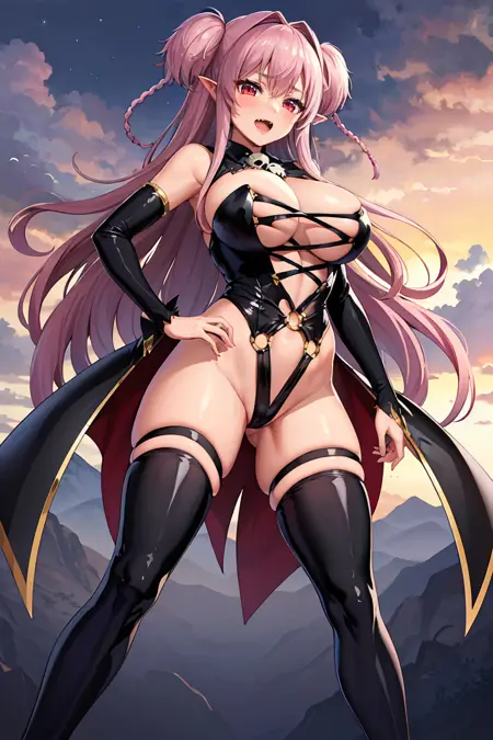 외모: iltwiska, 긴 머리카락, 보라색 머리카락, 빨간 눈, 양쪽 올려매긴 머리, 측면 머리카락, 뾰족한 귀, 중간 크기의 가슴