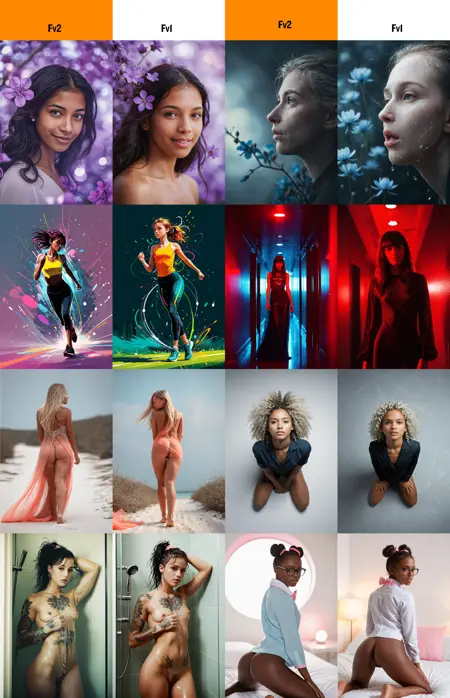 DPM++ 2/3M SDE / Karras 或 Exponential 通常都是不错的选择,建议步数 25+,CFG 值约为 5–7。但也可以尝试 DPM++ SDE / Karras,步数较少(如 12)而 CFG 较高(8–11),或使用 Euler Ancestral / Normal 以获得细节较少、但可能更有趣的效果,尤其对于 Fv6 模型,可减少“噪点感”。
