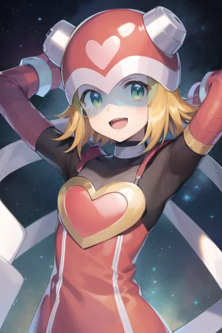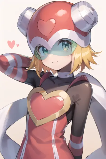 blonde hair, short hair, bodysuit, heart, helmet, green eyes