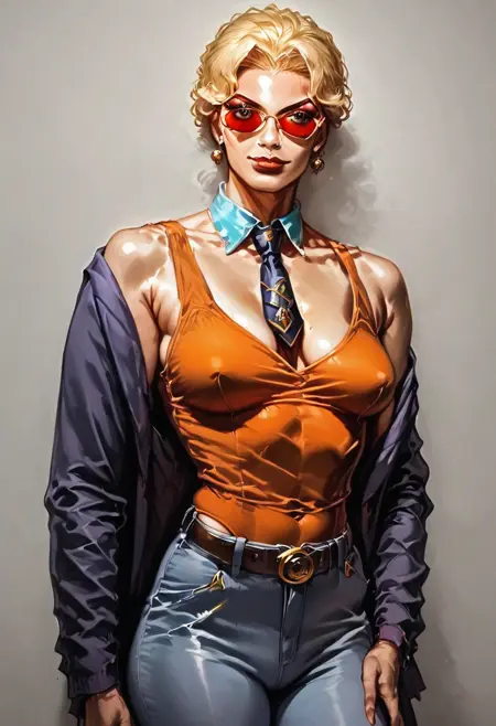 Maintaining Character Traits: Key characteristics such as confident eyes, high cheekbones, short blonde hair, and red-tinted eyewear are consistently represented.
