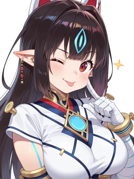 태그(옷): 뒤머리에 여우 마스크, 흰색 일본 드레스, 흰색 붕대 감은 장갑, 볼 귀걸이, 파란색 가슴 보석, 흰색 붕대 감은 하의,
