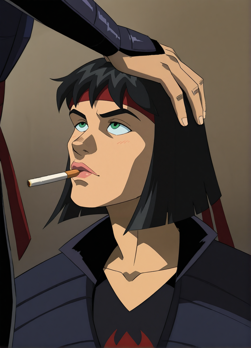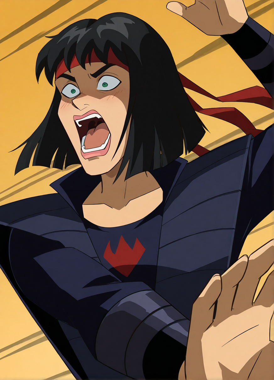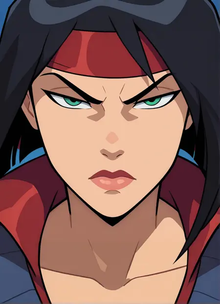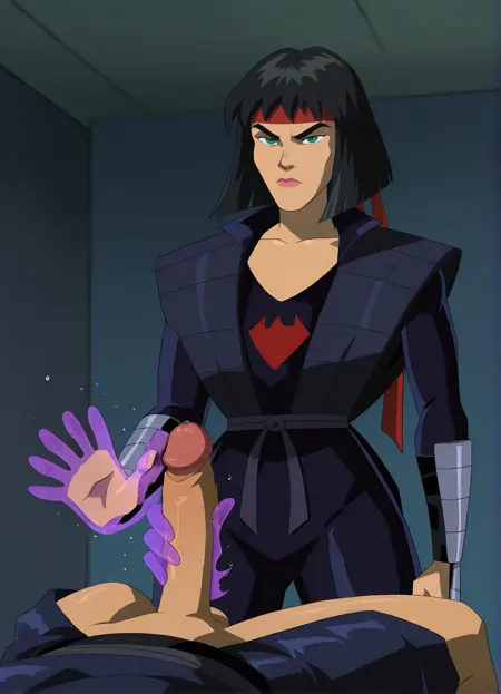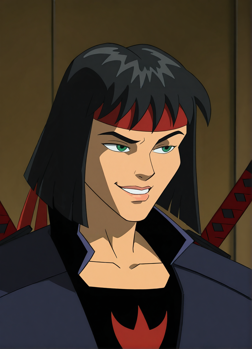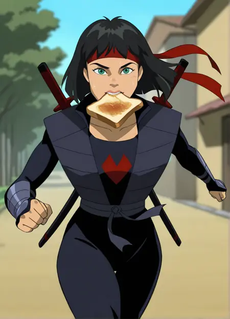 标签:忍者服装、手套、红色头巾、背后佩带鞘中剑、背部绑有 katana 剑、靴子、胫甲、只鞋靴、手持长剑,