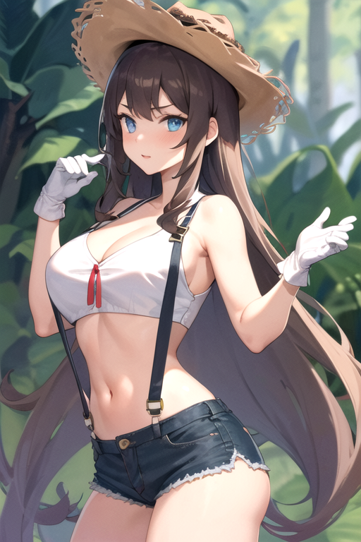 | 训练词汇 | Lumb3rj4neLO, 1girl, solo, long hair, blue eyes, large breasts, brown hair, shirt, white gloves, navel, cleavage, bare shoulders, short shorts, sleeveless, midriff, crop top, suspenders, denim shorts, open fly, cutoffs, micro shorts, cowboy hat, suspender shorts已复制! |