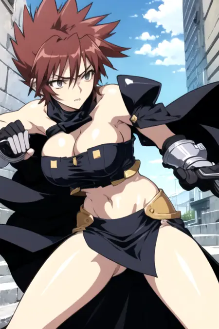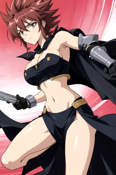 SetsunaOomidoh, 1girl, solo, short hair, skirt, large breasts, brown hair, gloves, navel, cleavage, midriff, cape, gun, spiked hair, side slit, bare shoulders, red hair