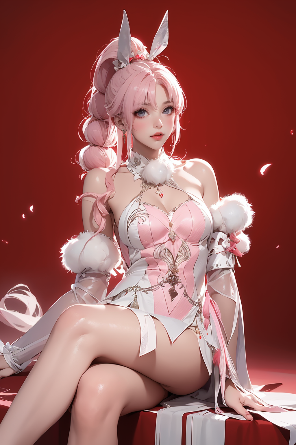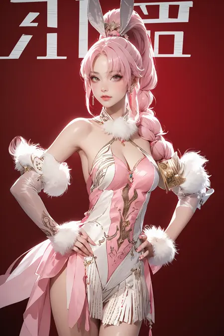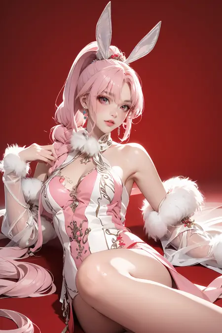 xiaowu,braided ponytail,clothing cutout,detached sleeves,feather hair ornament,jewelry,rabbit ears,pink hair,