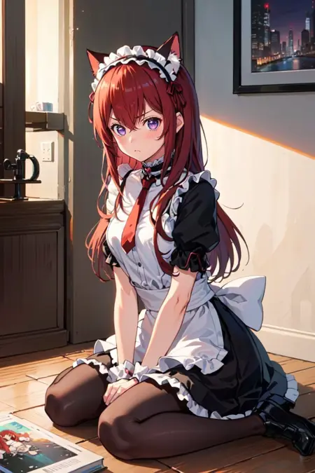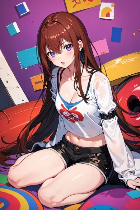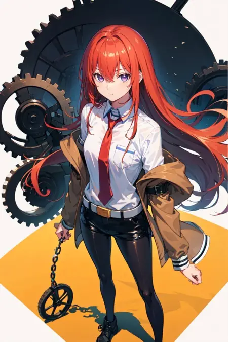 初学者可直接使用以下标签:pikkykurisu, 1girl, solo, looking at viewer, brown hair, red hair, long hair, eyes visible through hair, bangs, hair between eyes, blue eyes, purple eyes, breasts, large breasts, shorts, pantyhose, jacket, shirt, red necktie, necktie, belt, white shirt, legwear under shorts, brown jacket, short shorts, long sleeves, black pantyhose, cowboy shot, blush