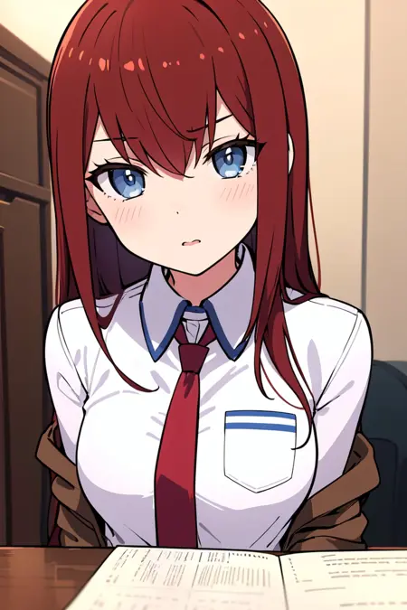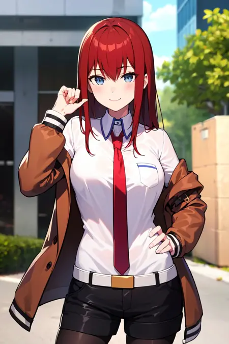 初学者可直接使用以下标签:pikkykurisu, 1girl, solo, looking at viewer, brown hair, red hair, long hair, eyes visible through hair, bangs, hair between eyes, blue eyes, purple eyes, breasts, large breasts, shorts, pantyhose, jacket, shirt, red necktie, necktie, belt, white shirt, legwear under shorts, brown jacket, short shorts, long sleeves, black pantyhose, cowboy shot, blush