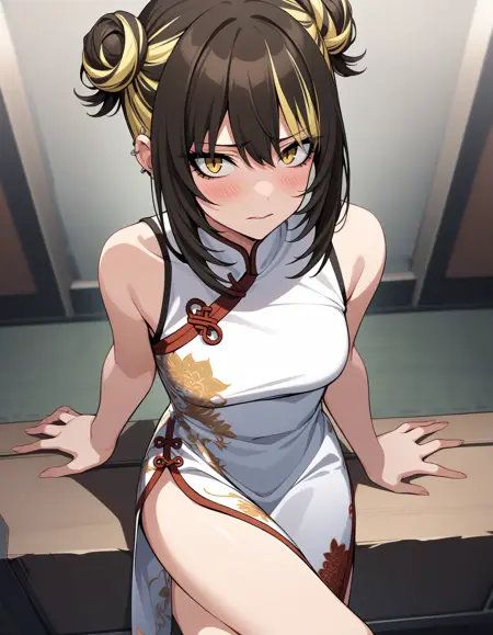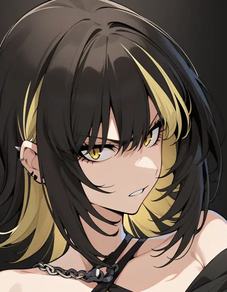 l_ikaruga, 1girl, blonde hair, yellow eyes, multicolored hair, bangs, black hair, hair between eyes, two-tone hair, colored inner hair, medium hair