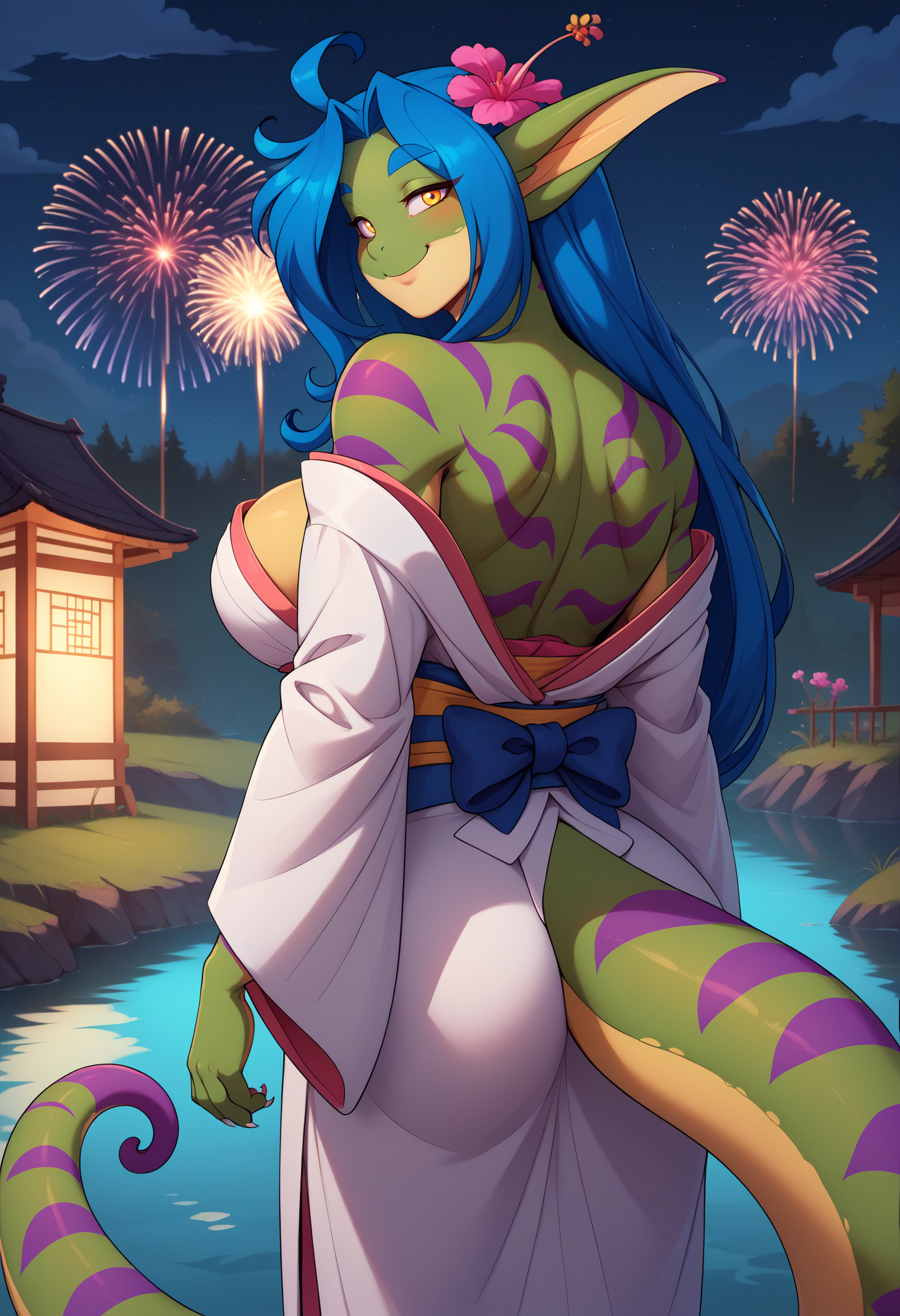 트리거: "gcku, 이톤 피부, 노란 눈, 도마뱀 소녀, 동물 귀, 도마뱀 꼬리, 파란 머리, 긴 머리, 머리 꽃, 발톱"은 항상 필요합니다.