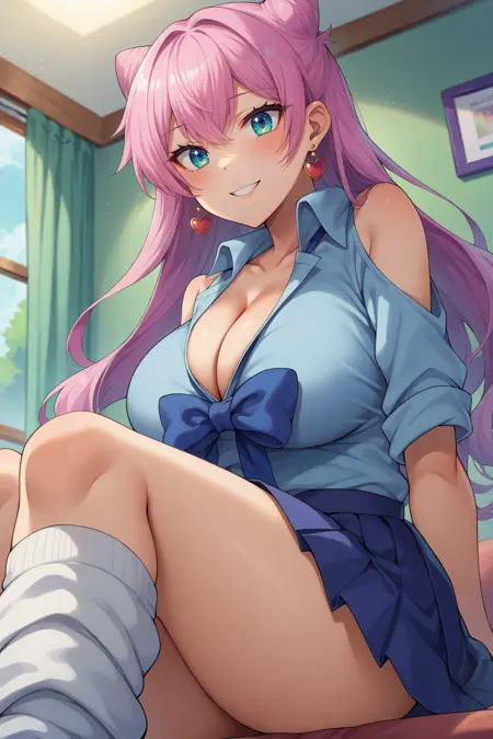 의상 1: 원추형 머리團, 더블 단, 하트 귀걸이, 파란색 칼라 셔츠, 어깨 절개, 가슴 노출, 파란색 리본, 소매 말아 올리기, 주름치마, 느슨한 양말