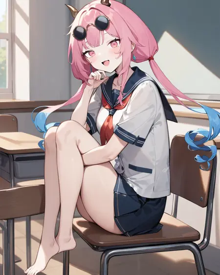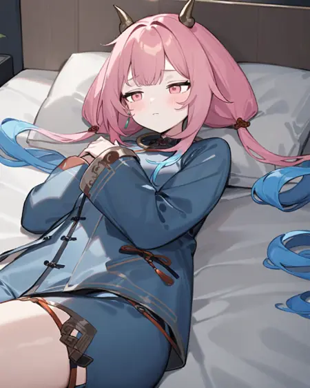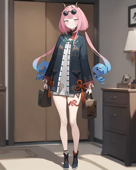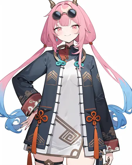 jinglang,1girl,solo,eyewear on head,horns,pink hair,pink eyes,multicolored hair,blue hair,dress,twintails,long hair,sunglasses,long sleeves,jewelry,dress,gradient hair,chinese clothes,round eyewear,earrings,