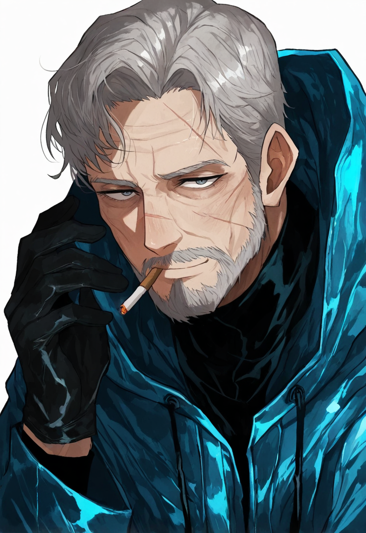 mature male, short hair, grey hair, beard, wrinkles, scars