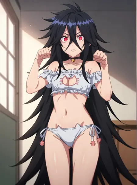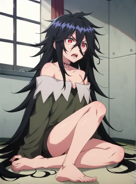 Prompts: long hair, black hair, , 1girl, hair between eyes, red eyes, messy hair, collarbone, very long hair,, off shoulder, barefoot