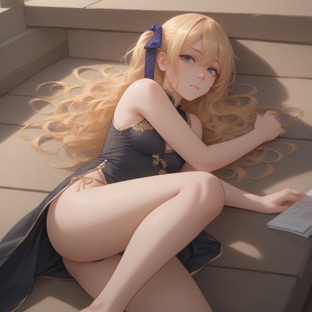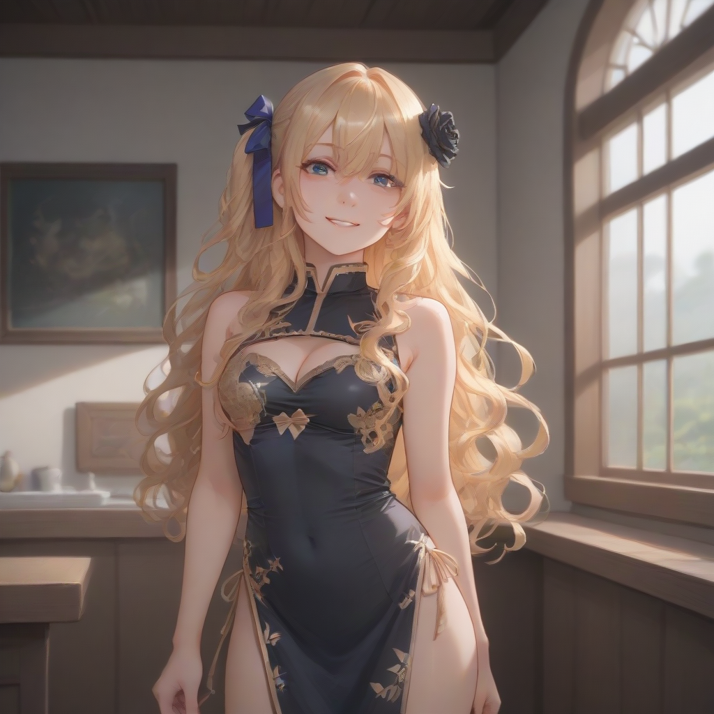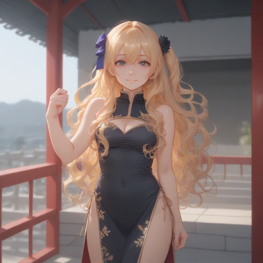 blonde hair, long hair, wavy hair, one side up, jin-lian, black hair flower, purple hair ribbon, side slit, black china dress