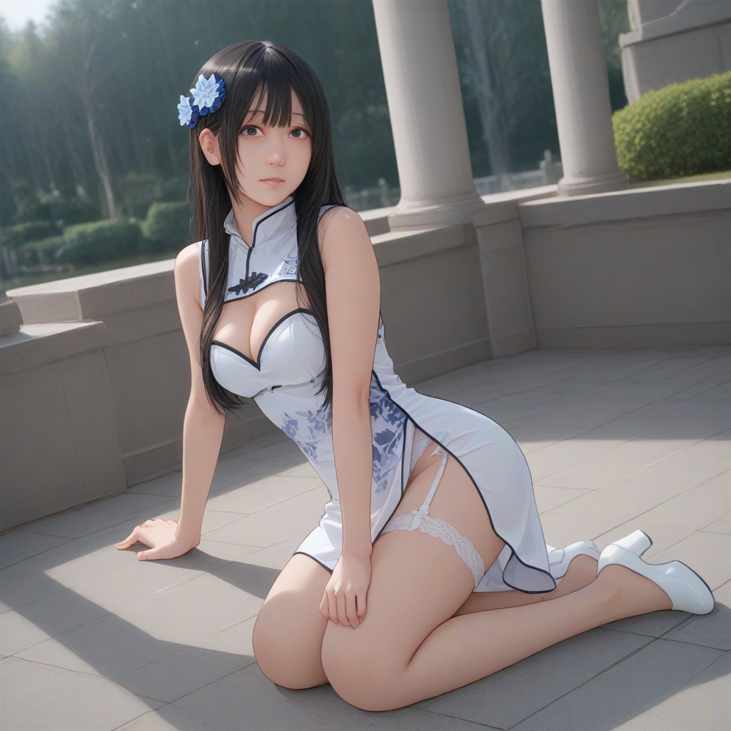 black hair, long hair, ping-yi, blue hair flower, white china dress,Jin-lian