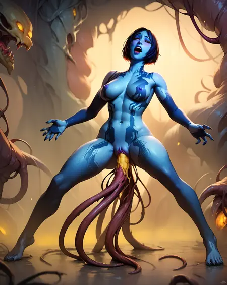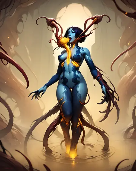 For girl infected use: floodh, infected, corruption, body horror, muscles, tentacles, yellow pods, yellow fog, claw, naked, head red tendrils, vaginal insertion,_**