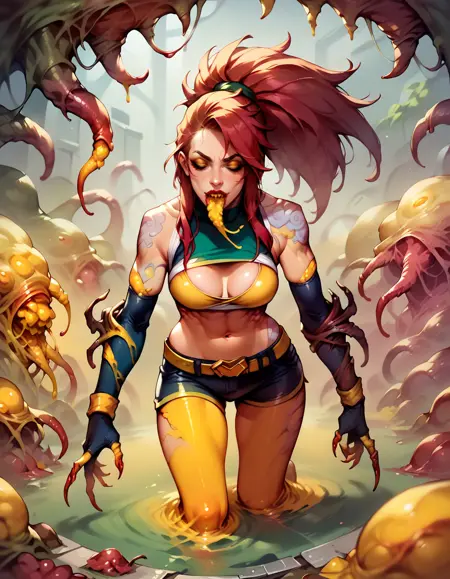 감염된 소녀 사용 시: floodh, 감염됨, 부패, 신체 공포, 근육, 촉수, 노란 포드, 노란 안개, 발톱, 벌거벗음, 머리의 빨간 줄기, 질 삽입,
