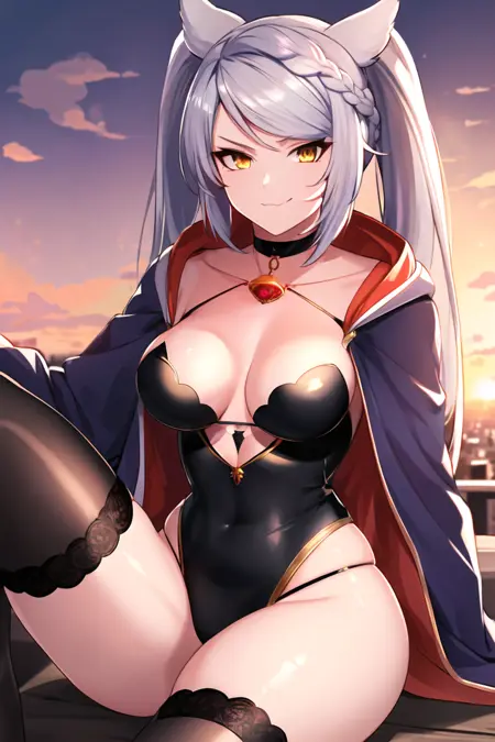 robeまたはhooded robe、肩を露出させるためのoff shoulder、leotard(ただし必要に応じて省略可能。多くの場合、元のレオタード風の服装に近いものが生成されます)、thighhighs、細部を強調するためのgold trim、pendant choker、wide sleeves。一部のモデルでは耳が正しく生成されない場合があります。その場合は