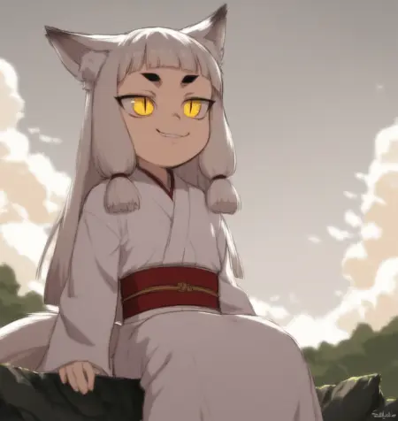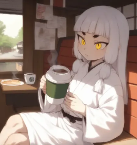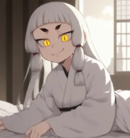 takakami, 1girl, japanese clothes, white kimono, bangs, slit pupils, short eyebrows, long hair, blunt bangs, white hair, young, yellow eyes,