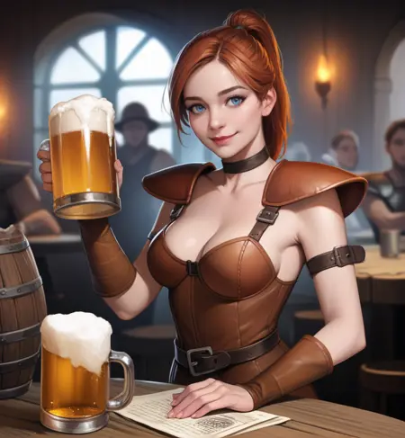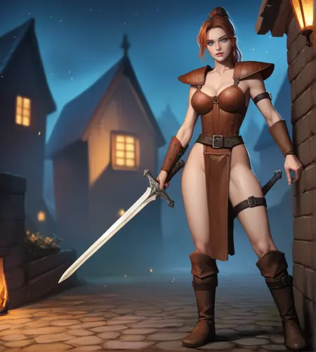 D2R 风格的正向提示词:1girl, DiabloFlavie, 蓝眼睛, 红褐色马尾, 项圈, 乳房, 肩甲, 臂甲, 带图案的皮甲, 腰带, 裙子, 靴子