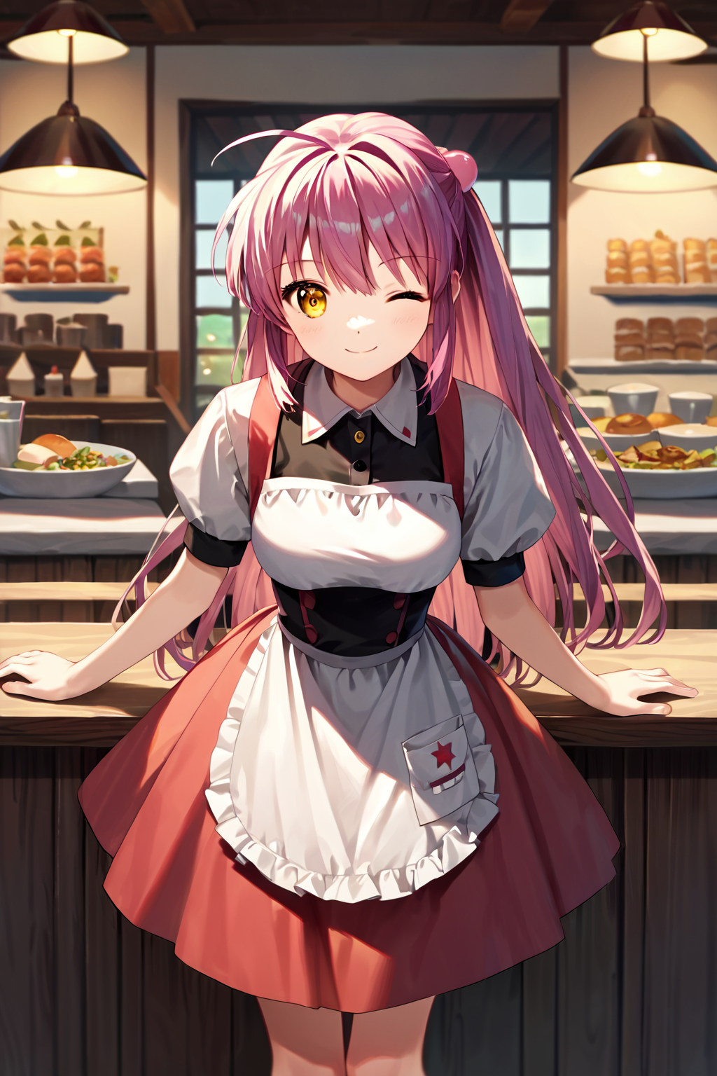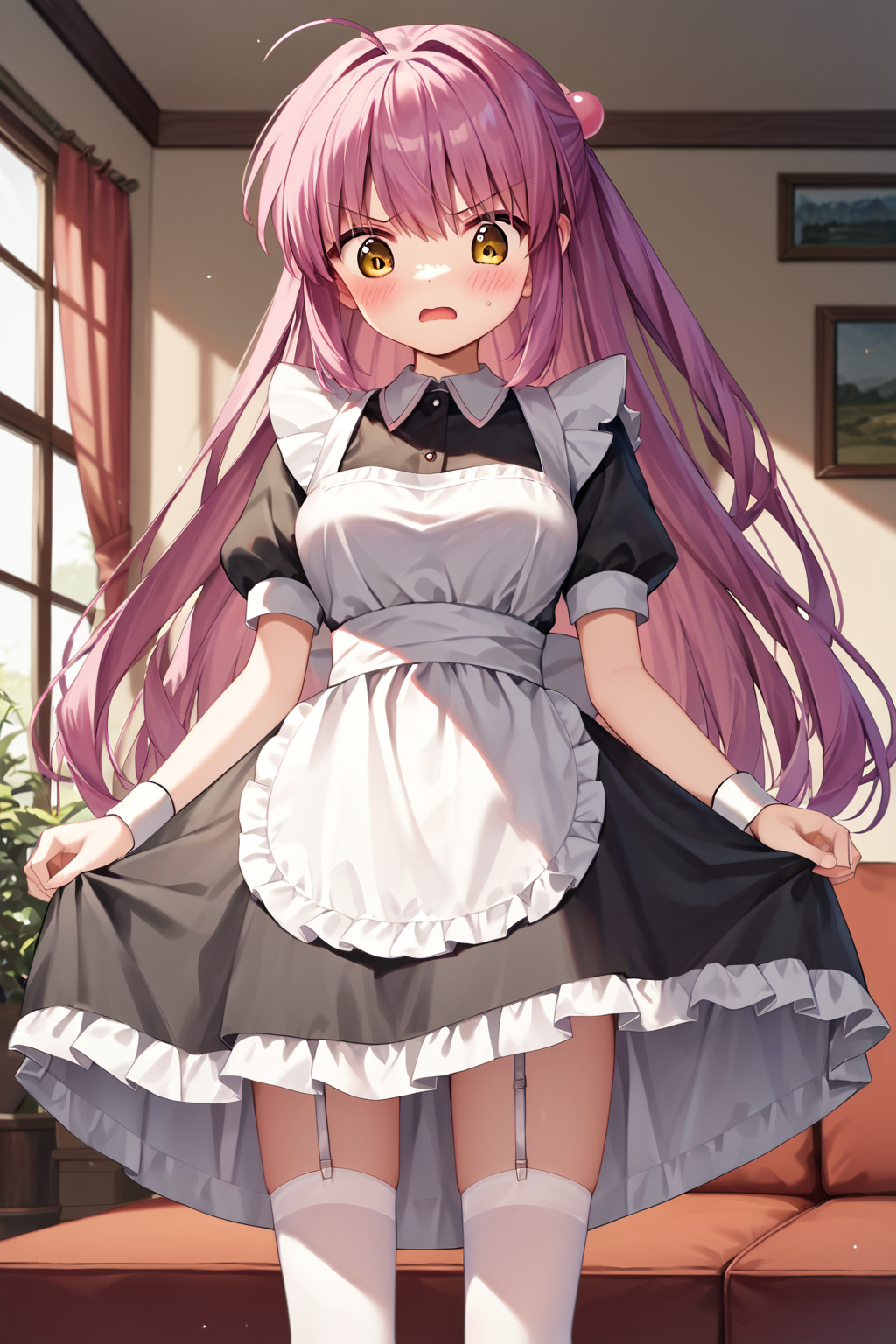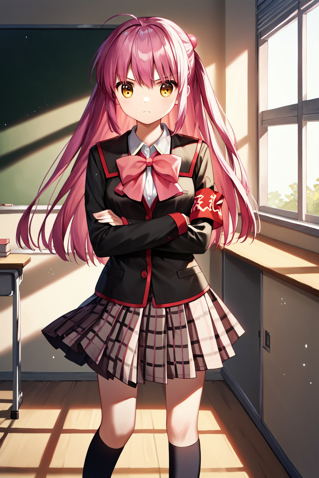 black and red school uniform with pink bow, pleated grey plaid skirt, red armband, black socks