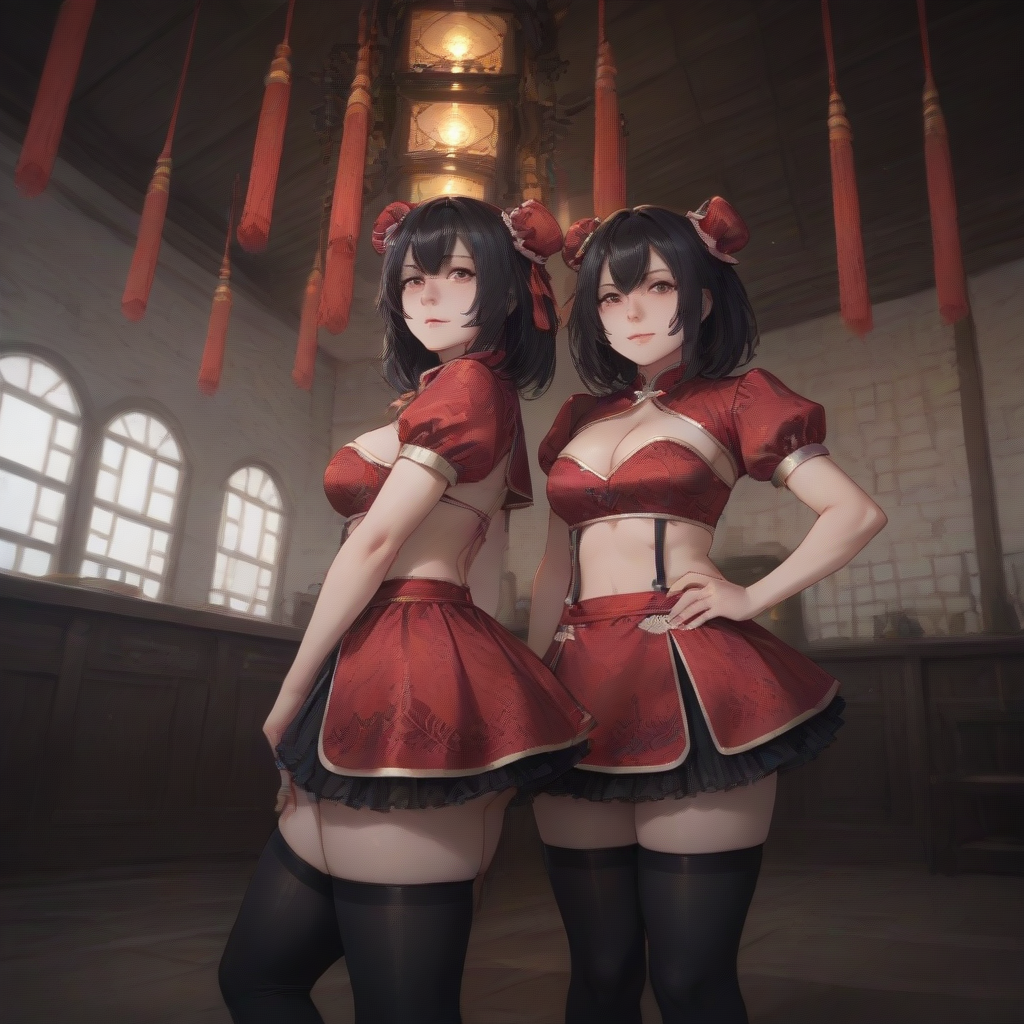 검은 허벅지 양말, 중국 옷, 빨간 치마, 가슴선, 더블 비ndo
