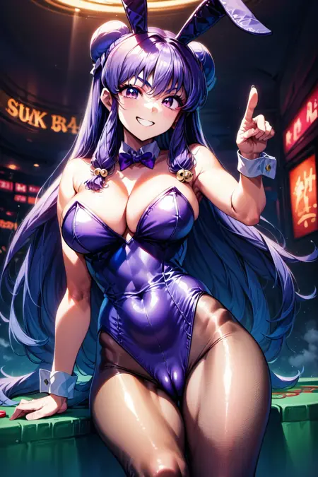 일반적인 외모: `purple_hair, purple_eyes, hair_bun, double_bun, hair_bell, long_hair`