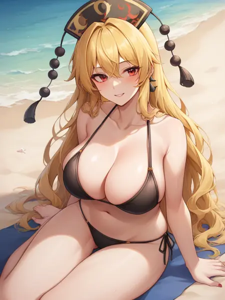 Trigger Words: "junko \(touhou\), blonde hair, red eyes, phoenix crown, large breasts,"