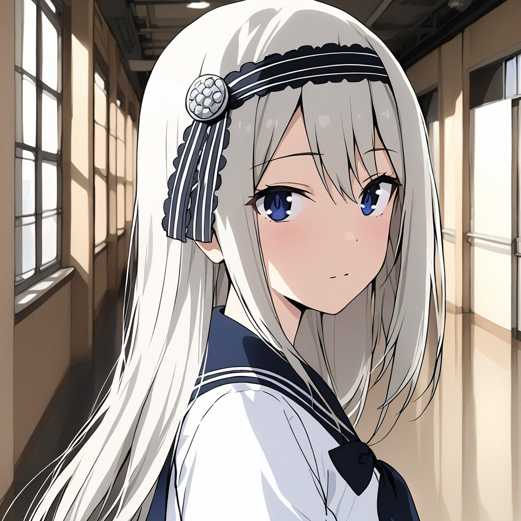 score_9, score_8_up, score_7_up, source_anime, white hair, depth of field, 1girl, kei, white dress, long sleeve, sailor collar, black pantyhose