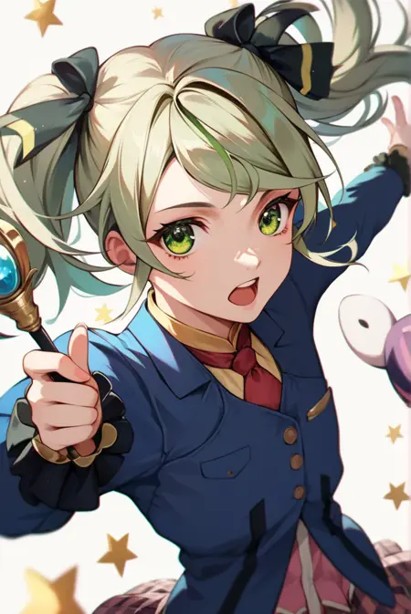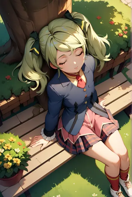 elize lutus, light green hair, green eyes, twintails, hair ribbon, red tie, navy blazer, pleated skirt, plaid skirt, frilled cuffs, pink dress, red socks, white shoes,