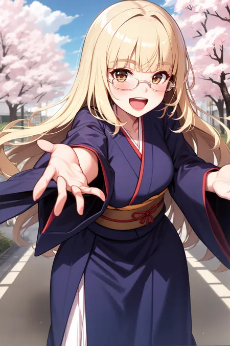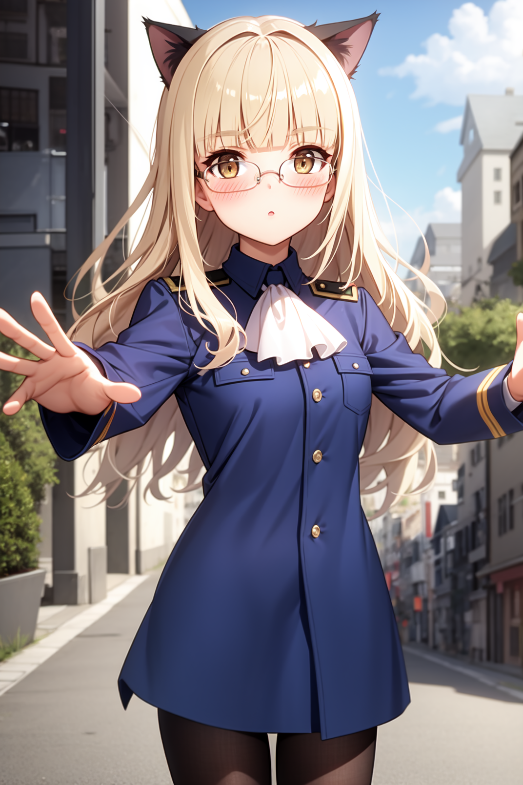 服装:眼鏡、青い軍服、長袖、白いアスコット、ズボンなし、黒いパンティストッキング、黒い靴