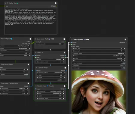 최고 버전 - v4.2 - 이제 wav2lip을 워크플로우에 추가했습니다. 누군가 이미 작동하는 노드를 만들었고, 이제 비디오를 불러와서 Whisper로 어시스턴트의 음성을 생성할 수 있으며, 이제 음성이 있는 애니메이션 아바타를 갖게 됩니다. 재미있는 워크플로우였고, 이를 조합하는 과정이 정말 흥미로웠습니다 lol. LLM 프로필을 구성하고, 서로 다른 커넥터를 제자리가 아닌 곳에 연결해보았습니다. 이 워크플로우 내에서 좋은 오디오를 얻을 수 있는 유일한 노드는 "Play sound (loop)"입니다. 경로를 입력으로 변환한 후, Whisper의 wav 출력을 Play sound의 입력으로 사용해야 합니다. 이렇게 하면 음성이 재생되어 들을 수 있습니다.