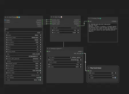 最佳版本 - v4.2 - 因此,已将 wav2lip 添加到工作流中,有人已经实现了可用的节点,现在你可以加载视频,让 Whisper 为你的助手生成语音,从而拥有一个会发声的动画头像。这个工作流很有趣,拼凑起来太棒了 lol。制作 LLM 人格配置,把不同连接器插到它们原本不属于的地方。在工作流中,只有“播放声音(循环)”这个节点能获得较好的音频效果。你必须将路径转换为输入,然后将 Whisper 的 wav 输出作为“播放声音”的输入。这样就能播放语音,让你听到声音。